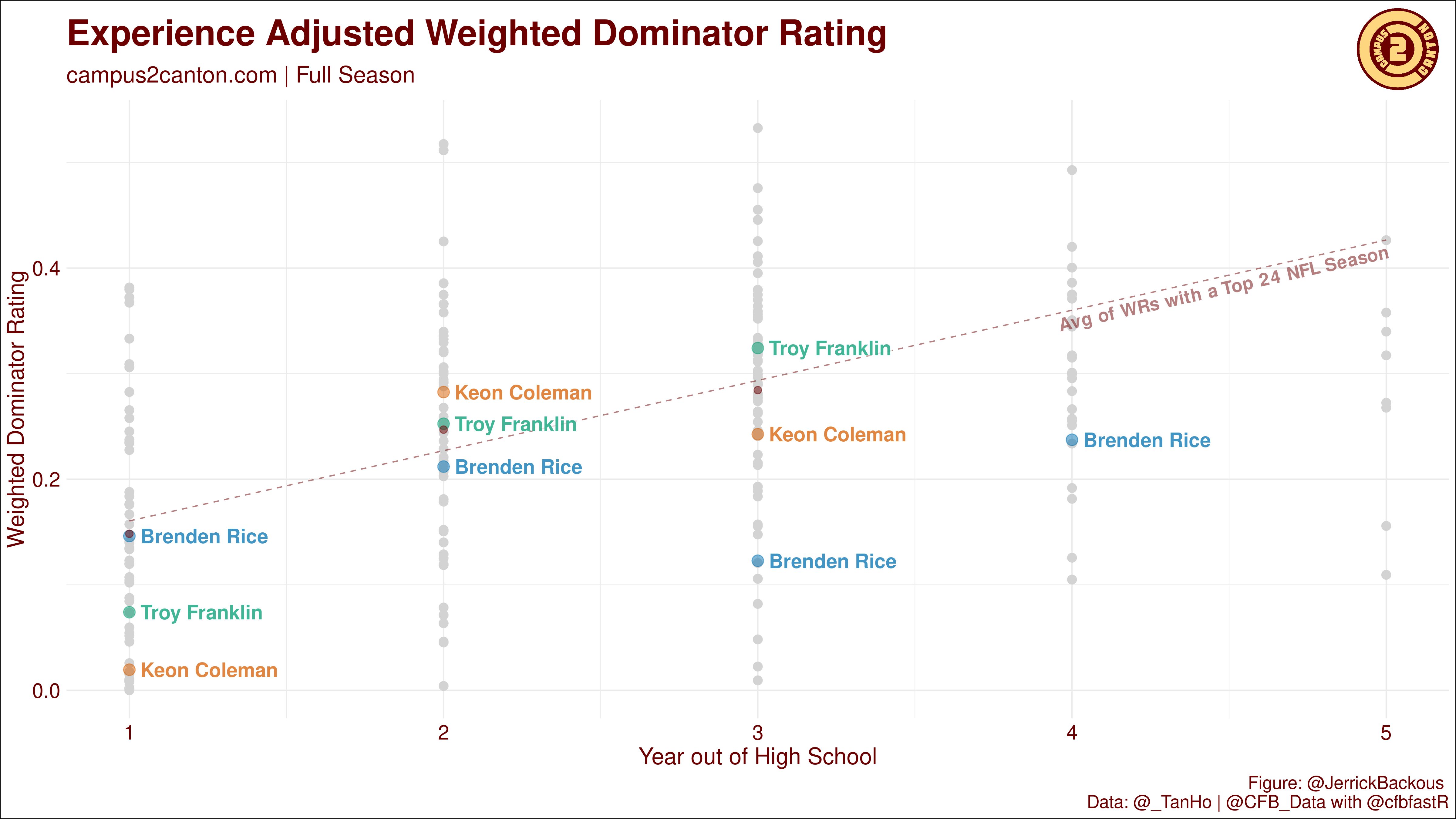 For years, the media has overinflated the talent of former sports stars’ children, valid in all sports. An example of this scenario is Jerry Rice Jr., who played football at UCLA and UNLV but never amounted to anything in the NFL. Coincidentally, the next potential sleeper receiver is his brother, Brenden Rice – a senior receiver at USC. Let’s take a look at him in Devy Sleeper Spotlight: Brenden Rice.